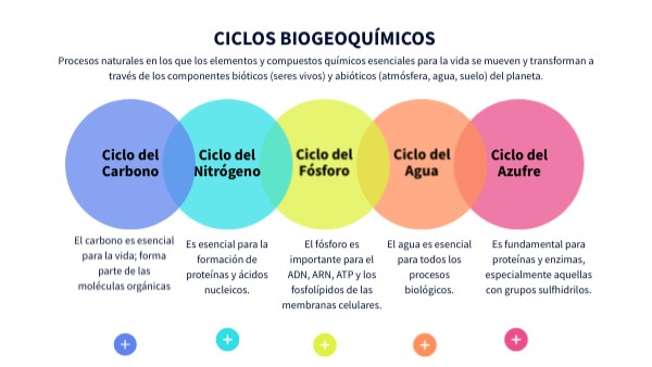 Procesos naturales en los que los elementos y compuestos químicos esenciales para la vida se mueven y transforman a través de los componentes bióticos (seres vivos) y abióticos (atmósfera, agua, suelo) del planeta.