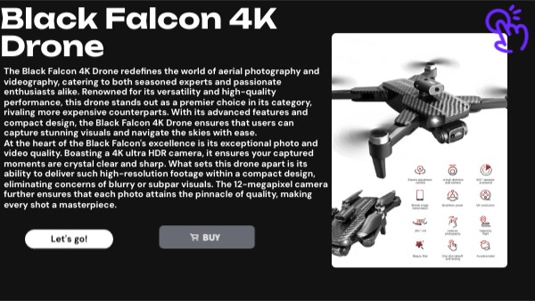 The Black Falcon 4K Drone redefines the world of aerial photography and videography, catering to both seasoned experts and passionate enthusiasts alike. Renowned for its versatility and high-quality performance, this drone stands out as a premier choice in its category, rivaling more expensive counterparts. With its advanced features and compact design, the Black Falcon 4K Drone ensures that users can capture stunning visuals and navigate the skies with ease. At the heart of the Black Falcon's excellence is its exceptional photo and video quality. Boasting a 4K ultra HDR camera, it ensures your captured moments are crystal clear and sharp. What sets this drone apart is its ability to deliver such high-resolution footage within a compact design, eliminating concerns of blurry or subpar visuals. The 12-megapixel camera further ensures that each photo attains the pinnacle of quality, making every shot a masterpiece.