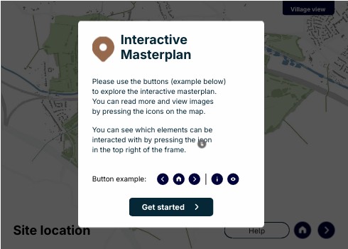Please use the buttons (example below) to explore the interactive masterplan. You can read more and view images by pressing the icons on the map, which has both a phasing and a villages view. You can see which elements can be interacted with by pressing the icon in the top right of the frame.