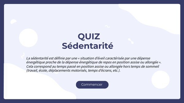 La sédentarité est définie par une « situation d’éveil caractérisée par une dépense énergétique proche de la dépense énergétique de repos en position assise ou allongée ». Cela correspond au temps passé en position assise ou allongée hors temps de sommeil (travail, école, déplacements motorisés, temps d’écrans, etc.).