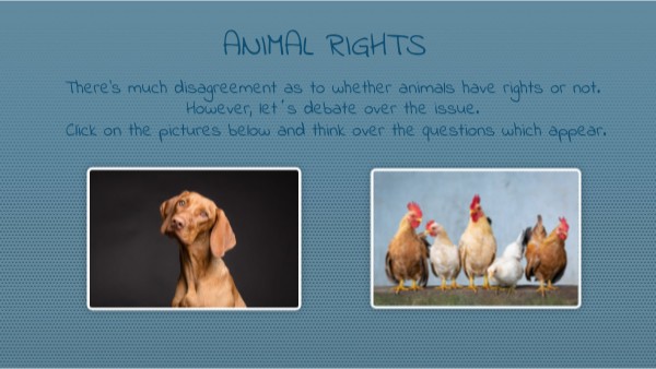 There's much disagreement as to whether animals have rights or not. However, let΄s debate over the issue. Click on the pictures below and think over the questions which appear.