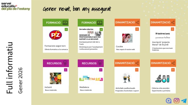 A partir del 7 de gener s'obren les inscripcions del 2n torn del Pla de formació de zona. Enviarem un correu electrònic als centres amb els enllaços de les formacions que s'ofereixen a la comarca.