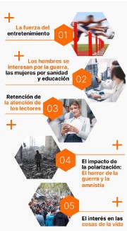 Los hombres muestran mayor interés por el deporte, las elecciones generales y los conflictos bélicos, mientras que las mujeres prefieren temas relacionados con bienestar, salud, sanidad, educación y cultura.