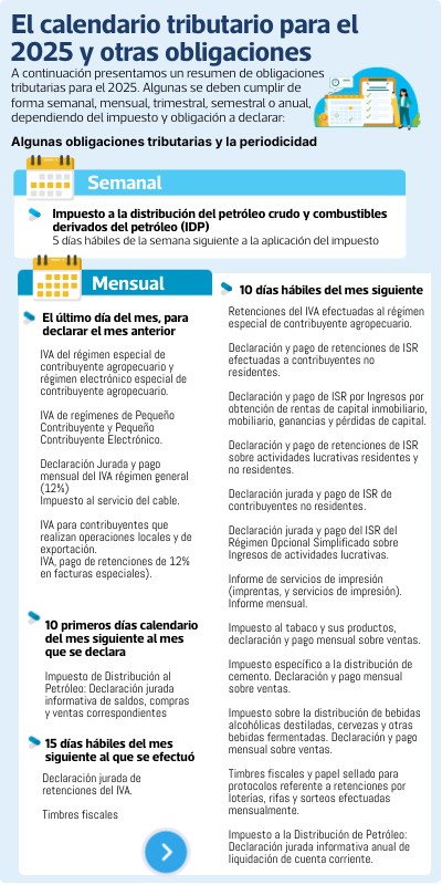 A continuación presentamos un resumen de obligaciones tributarias para el 2025. Algunas se deben cumplir de forma semanal, mensual, trimestral, semestral o anual, dependiendo del impuesto y obligación a declarar: