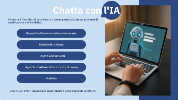 Consulta il Chat-Bot AI per ricevere risposte personalizzate sul processo di certificazione dell'invalidità.