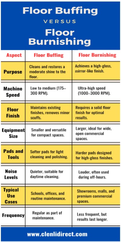 Floor buffing vs. Floor burnishing: Are you wondering what the best way to keep your floor shining is? Check out our infographic to understand the differences between these two in simple terms!