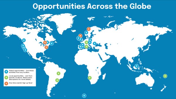 Global opportunities - Join these activities from any location. Local opportunities - Join from specific locations. Read action descriptions for more details. One-time events! Sign up Now!