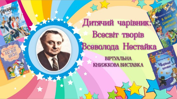 Юні друзі! Запрошуємо вас долучитися до нашої віртуальної книжкової подорожі до дивовижного, веселого, незвичайного світу книжок українського чарівника Всеволода Нестайка! Усі вони написані для вас! Ми впевнені, що кожен із вас знайде на виставці особливу для себе книжку!