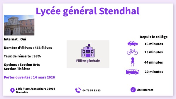 Internat : OuiNombre d'élèves : 463 élèves Taux de réussite : 98% Options : Section Arts Section Théâtre Portes ouvertes : 14 mars 2026