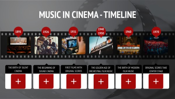The Lumière brothers present the first film projections. During this era, movie music is performed live by pianists or small orchestras to accompany the images and mask the noise of the projector.