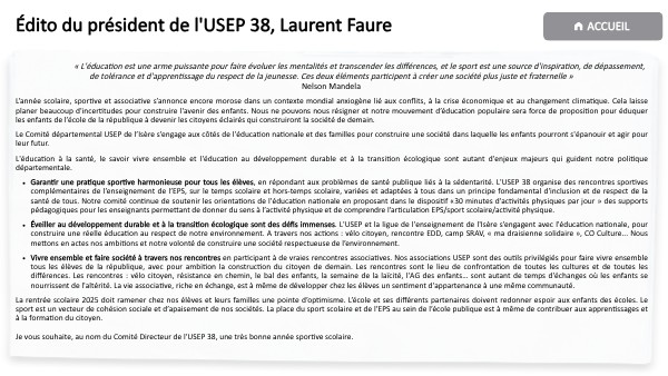 La rentrée scolaire 2025 doit ramener chez nos élèves et leurs familles une pointe d’optimisme. L’école et ses différents partenaires doivent redonner espoir aux enfants des écoles. Le sport est un vecteur de cohésion sociale et d’apaisement de nos sociétés. La place du sport scolaire et de l’EPS au sein de l’école publique est à même de contribuer aux apprentissages et à la formation du citoyen. Je vous souhaite, au nom du Comité Directeur de l’USEP 38, une très bonne année sportive scolaire."L' Usep, le sport scolaire pour bien grandir ensemble"