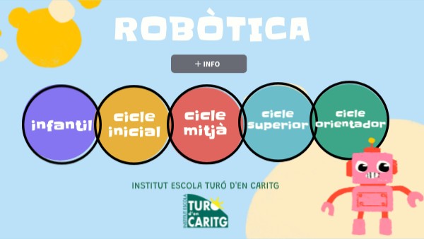 En aquest Genially trobareu dividit per cicles la següent informació:- Les fitxes resum - Els manuals d’ús i d’instal·lació del programari - Vídeos explicatius - Recursos addicionals I altres informacions relacionades amb els robots educatius, les plaques microcontroladores i els components i accessoris disponibles relacionades amb la dotació de robòtica de què disposa el centre.