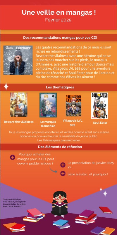 Les quatre recommandations de ce mois-ci sont riches en rebondissements ! Beware the vilainess avec une héroïne qui ne se laissera pas marcher sur les pieds, le marquis d'Amnésie, avec une histoire d'amour douce mais complexe, Villageois LVL 999 pour une aventure pleine de ténacité et Soul Eater pour de l'action et du rire comme nos élèves les aiment !