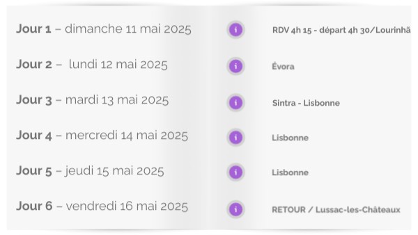 Jour 1 – dimanche 11 mai 2025Jour 2 – lundi 12 mai 2025Jour 3 – mardi 13 mai 2025Jour 4 – mercredi 14 mai 2025Jour 5 – jeudi 15 mai 2025Jour 6 – vendredi 16 mai 2025