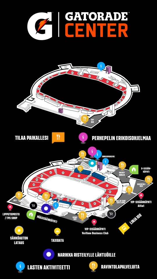 Voit tilata ruokaa, juomaa ja fanituotteita suoraan istuimellesi. Sovelluksen lataaminen on ilmaista, eikä tilatuista tuotteista veloiteta lisähintaa. Lataa TPS- tai Gatorade-sovellus matkapuhelimeesi App Storesta tai Google Play Kaupasta. Applikaation kautta voit tilata tuotteita kaikkiin katsomonosiin - katsomoravintolaan, yläkatsomoon ja jopa aitioihin.