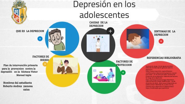 Factores de riesgo. (12 de Agosto de 2022). Obtenido de Descripción general sobre la deprecion : https://www.mayoclinic.org/es/diseases-conditions/teen-depression/symptoms-causes/ guia salud . (11 de junio de 2020). Factores de protección de la depresión. Obtenido de Factores de riesgo de la depresión: https://portal.guiasalud.es/egpc/depresion-infancia-factores-riesgo/ Medline plus . (14 de diciembre de 2022). ¿Qué causa la depresión en adolescentes? Obtenido de ¿Cuáles son los síntomas de la depresión en adolescentes?: https://medlineplus.gov/spanish/te