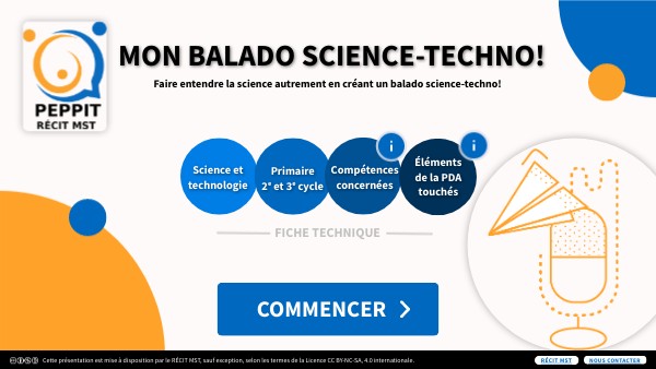 Mise en situation Imaginez-vous comme de véritables influenceurs scientifiques ! Le monde de la baladodiffusion est en pleine effervescence. Des millions de personnes écoutent chaque jour des balado sur tous les sujets imaginables. Et si vous, les futurs scientifiques, deveniez les voix d'une nouvelle génération consciente de l'environnement ? Votre mission ? Créer un balado percutant pour sensibiliser vos pairs à l'importance d'une thématique scientifique et à son impact sur notre société. Vous avez le pouvoir d'informer, de questionner et d'inspirer. Production attendue Diffusion d'un balado sur la thématique choisie. Consultez la liste des suggestions de thématiques dans la phase de préparation de cette PEPPIT.