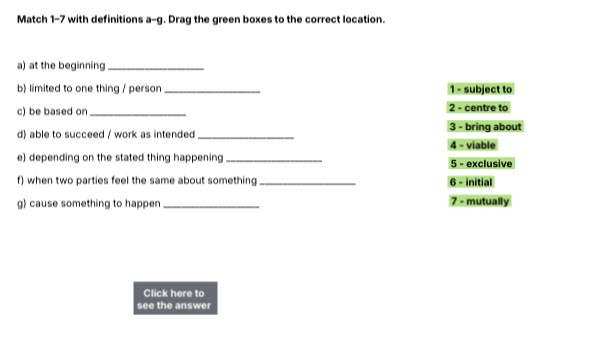 Match 1–7 with definitions a–g. Drag the green boxes to the correct location. a) at the beginning _____________________ b) limited to one thing / person _____________________ c) be based on _____________________ d) able to succeed / work as intended _____________________ e) depending on the stated thing happening _____________________ f) when two parties feel the same about something _____________________ g) cause something to happen _____________________
