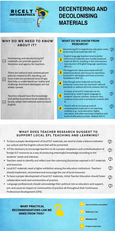 Decentering and decolonising ELT materials can provide spaces of liberation and agency for teachers.There are national and contextualised policies related to EFL teaching, yet local materials produced accordingly that help us understand our reality and challenge dominant ideologies are not widely spread. Teachers should have the knowledge and ability to produce local materials or locally adapt international ones to teach English.