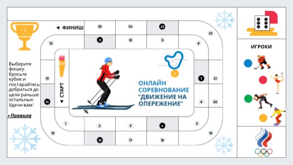 В игре могут участвовать от 2 до 4 игроков. Каждый игрок должен выбрать фишку (жёлтую, синюю, красную или зелёную) и бросить кубик. Чтобы начать игру, каждый участник должен бросить кубик и переместить свою фигуру на соответствующий квадрат. Каждый квадрат содержит вопрос на тему «Зимние виды спорта». Если игрок отвечает правильно, он может двигаться дальше, если нет, то очередь переходит к следующему игроку. На доске также есть 6 специальных квадратов (серых с чёрным номером), в которых игрок, при правильном ответе на вопрос, может передвинуться на 2 клетки вперед. Выигрывает игрок, который достигнет финишной черты первым.