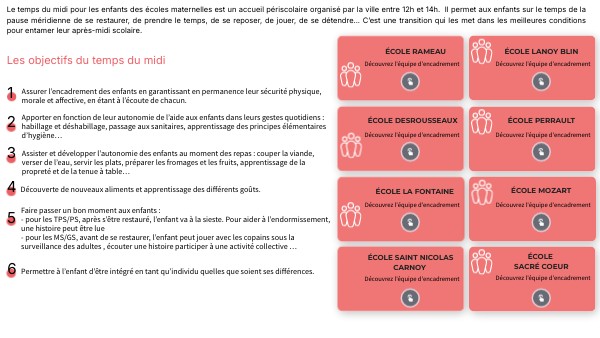 Le temps du midi pour les enfants des écoles maternelles est un accueil périscolaire organisé par la ville entre 12h et 14h. Il permet aux enfants sur le temps de la pause méridienne de se restaurer, de prendre le temps, de se reposer, de jouer, de se détendre... C’est une transition qui les met dans les meilleures conditions pour entamer leur après-midi scolaire.