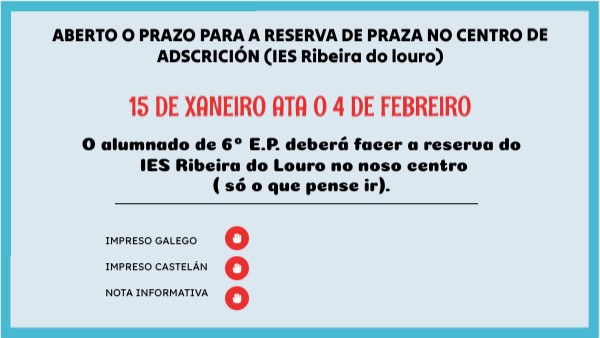O alumnado de 6º E.P. deberá facer a reserva do IES Ribeira do Louro no noso centro ( só o que pense ir).