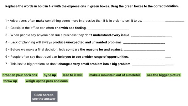 Replace the words in bold in 1–7 with the expressions in green boxes. Drag the green boxes to the correct location. 1 - Advertisers often make something seem more impressive than it is in order to sell it to us. _____________________________ 2 - Gossip in the office can often end with bad feeling. _____________________________ 3 - When people say anyone can run a business they don’t understand every issue. _____________________________ 4 - Lack of planning will always produce unexpected and unwanted problems. _____________________________ 5 - Before we make a final decision, let’s compare the reasons for and against. _____________________________ 6 - People often say that travel can help you to see a wider range of opportunities. _____________________________ 7 - This isn’t a big problem so don’t change a very small problem into a big problem. _____________________________
