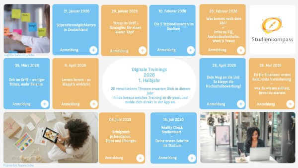 Du planst ein Brückenjahr oder bist du schon mitten drin und fragst dich, wie du diese Zeit optimal nutzen kannst? Im digitalen Training „Brückenjahr erfolgreich gestalten – Mit dem Studienkompass ins nächste Kapitel“ kannst du dich mit erfahrenen Teilnehmenden austauschen und erhältst wertvolle Tipps, wie du dein Brückenjahr sinnvoll gestaltest und den Übergang zum Studium oder zur Ausbildung meisterst. Im Fokus stehen unter anderem: • Wie gestalte ich mein Brückenjahr klug und verliere den Fokus auf die nächste Etappe nicht? • Wie unterstützt mich der Studienkompass in dieser Zeit?