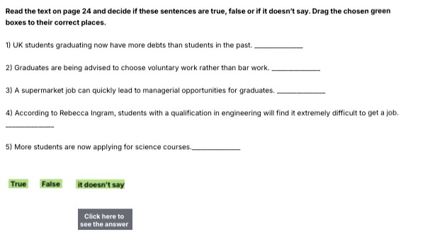 Read the text on page 24 and decide if these sentences are true, false or if it doesn’t say. Drag the chosen green boxes to their correct places. 1) UK students graduating now have more debts than students in the past. _______________ 2) Graduates are being advised to choose voluntary work rather than bar work. _______________ 3) A supermarket job can quickly lead to managerial opportunities for graduates. _______________ 4) According to Rebecca Ingram, students with a qualification in engineering will find it extremely difficult to get a job. _______________ 5) More students are now applying for science courses._______________