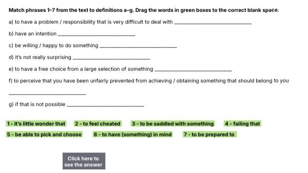 Match phrases 1–7 from the text to definitions a–g. Drag the words in green boxes to the correct blank space. a) to have a problem / responsibility that is very difficult to deal with _________________________________ b) have an intention _________________________________ c) be willing / happy to do something _________________________________ d) it’s not really surprising _________________________________ e) to have a free choice from a large selection of something _________________________________ f) to perceive that you have been unfairly prevented from achieving / obtaining something that should belong to you _________________________________ g) if that is not possible _________________________________
