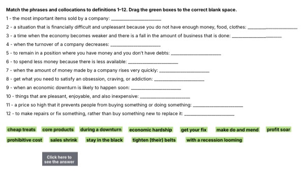 1 core products - 2 economic hardship - 3 during a downturn - 4 sales shrink 5 stay in the black - 6 tighten (their) belts - 7 profits soar - 8 get your fix 9 with a recession looming - 10 cheap treats - 11 prohibitive cost - 12 make do and mend