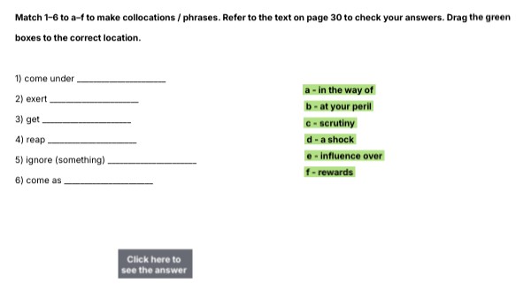 Match 1–6 to a–f to make collocations / phrases. Refer to the text on page 30 to check your answers. Drag the green boxes to the correct location. 1) come under ______________________ 2) exert ______________________ 3) get ______________________ 4) reap ______________________ 5) ignore (something) ______________________ 6) come as ______________________