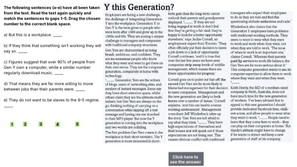 The following sentences (a–e) have all been taken from the text. Read the text again quickly and match the sentences to gaps 1–5. Drag the chosen number to the correct blank space. a) But this is a workplace. _____ b) If they think that something isn’t working they will say so. _____ c) Figures suggest that over 90% of people from Gen Y own a computer, while a similar number regularly download music. _____ d) That means they are far more willing to move between jobs than their parents were. _____ e) They do not want to be slaves to the 9–5 regime. _____