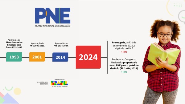 O presidente Luiz Inácio Lula da Silva sancionou a Lei 14.934, de 25 de julho de 2024, que prorroga até 31 de dezembro de 2025 a vigência do Plano Nacional de Educação (PNE).