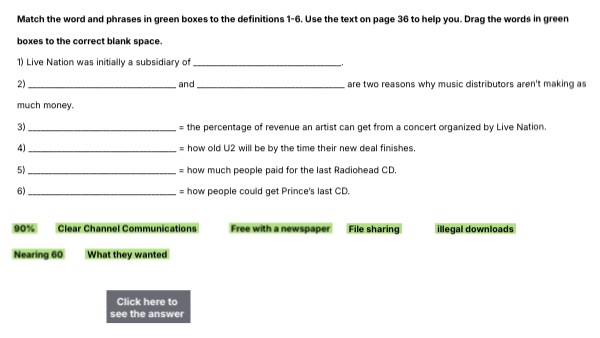 Match the word and phrases in green boxes to the definitions 1-6. Use the text on page 36 to help you. Drag the words in green boxes to the correct blank space. 1) Live Nation was initially a subsidiary of ____________________________________. 2) ____________________________________ and ____________________________________ are two reasons why music distributors aren’t making as much money. 3) ____________________________________ = the percentage of revenue an artist can get from a concert organized by Live Nation. 4) ____________________________________ = how old U2 will be by the time their new deal finishes. 5) ____________________________________ = how much people paid for the last Radiohead CD. 6) ____________________________________ = how people could get Prince’s last CD.