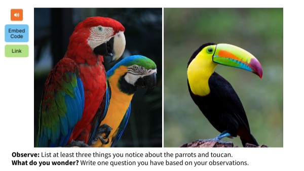 Observe: List at least three things you notice about the parrots and toucan.What do you wonder? Write one question you have based on your observations.