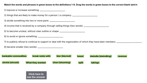 Match the words and phrases in green boxes to the definitions 1-8. Drag the words in green boxes to the correct blank space. 1) improve or increase something: _________________________ 2) things that are likely to make money for a person / a company: _________________________ 3) divide something into two or more parts: _________________________ 4) income that is received by a company through selling things (two words): _________________________ 5) to become unclear; without clear outline or shape: _________________________ 6) to avoid or ignore something: _________________________ 7) to publicly refuse to continue to support or deal with the organization of which they have been members: _________________________ 8) became smaller (two words): _________________________