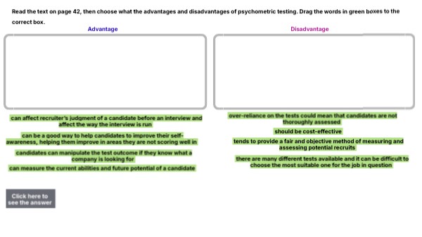 Read the text on page 42, then choose what the advantages and disadvantages of psychometric testing. Drag the words in green boxes to the correct box.