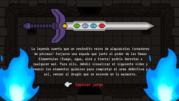 La leyenda cuenta que un recóndito reino de alquimistas (creadores de pócimas) forjaron una espada que junto al poder de las Gemas Elementales (fuego, agua, aire y tierra) podría derrotar a cualquier mal. Para ello, debéis visualizar el siguiente vídeo y reunir los elementos químicos para completar el arma definitiva y así, vencer al dragón que se esconde en la mazmorra.