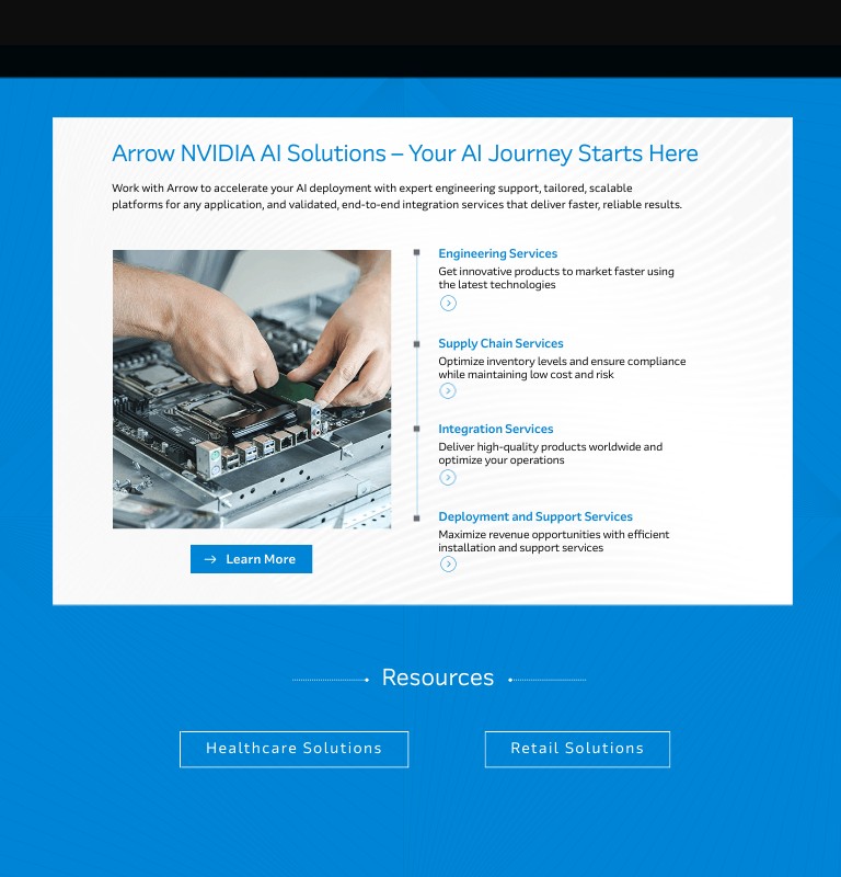 Work with Arrow to accelerate your AI deployment with expert engineering support, tailored, scalable platforms for any application, and validated, end-to-end integration services that deliver faster, reliable results.
