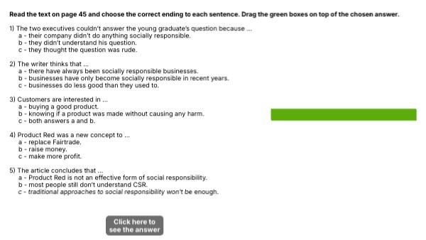 Read the text on page 45 and choose the correct ending to each sentence. Drag the green boxes on top of the chosen answer. 1) The two executives couldn’t answer the young graduate’s question because … a - their company didn’t do anything socially responsible. b - they didn’t understand his question. c - they thought the question was rude. 2) The writer thinks that … a - there have always been socially responsible businesses. b - businesses have only become socially responsible in recent years. c - businesses do less good than they used to. 3) Customers are interested in … a - buying a good product. b - knowing if a product was made without causing any harm. c - both answers a and b. 4) Product Red was a new concept to … a - replace Fairtrade. b - raise money. c - make more profit. 5) The article concludes that … a - Product Red is not an effective form of social responsibility. b - most people still don’t understand CSR. c - traditional approaches to social responsibility won’t be enough.