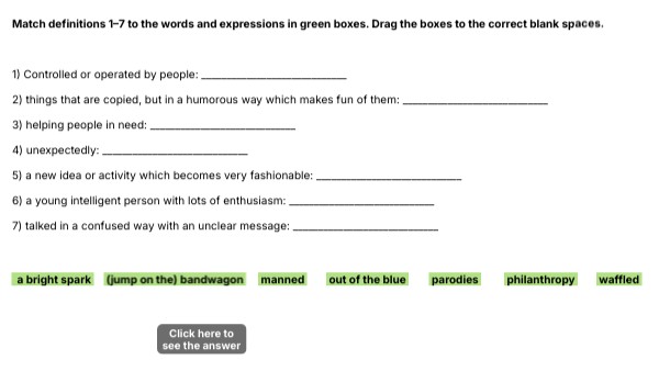 Match definitions 1–7 to the words and expressions in green boxes. Drag the boxes to the correct blank spaces. 1) Controlled or operated by people: _____________________________ 2) things that are copied, but in a humorous way which makes fun of them: _____________________________ 3) helping people in need: _____________________________ 4) unexpectedly: _____________________________ 5) a new idea or activity which becomes very fashionable: _____________________________ 6) a young intelligent person with lots of enthusiasm: _____________________________ 7) talked in a confused way with an unclear message: _____________________________