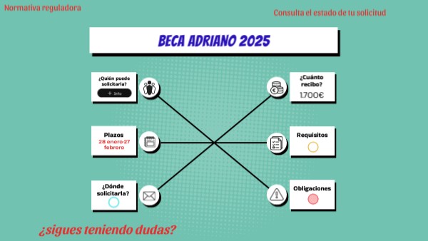 Para solicitar la beca Adriano, pincha AQUÍ. IMPORTANTE: El proceso NO FINALIZA de forma telemática por lo que la solicitud impresa y firmada, junto con la documentación que debe acompañar a la solicitud, en su caso, debe ser presentada, preferentemente, en el centro educativo.