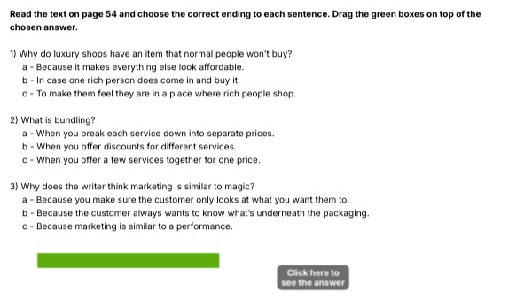 Read the text on page 54 and choose the correct ending to each sentence. Drag the green boxes on top of the chosen answer. 1) Why do luxury shops have an item that normal people won’t buy? a - Because it makes everything else look affordable. b - In case one rich person does come in and buy it. c - To make them feel they are in a place where rich people shop. 2) What is bundling? a - When you break each service down into separate prices. b - When you offer discounts for different services. c - When you offer a few services together for one price. 3) Why does the writer think marketing is similar to magic? a - Because you make sure the customer only looks at what you want them to. b - Because the customer always wants to know what’s underneath the packaging. c - Because marketing is similar to a performance.