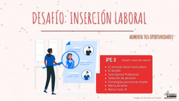 A lo largo del módulo de Itinerario Personal para la Empleabilidad (IPE) has ido adquiriendo una serie de competencias y habilidades que te permiten mejorar tus posibilidades de inserción laboral. Pero con eso no basta, es el momento de planificar y poner en marcha estrategias que te ayuden a realizar con éxito procesos selectivos de empleo para que desarrolles tu carrera profesional. Y para ello, te he preparado este recorrido: