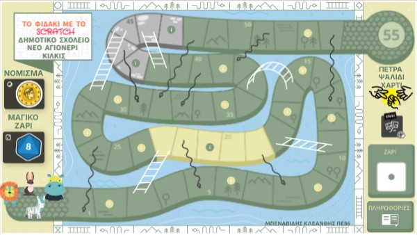 Το ψηφιακό παιχνίδι Το Φιδάκι με το Scratch είναι ένα παιχνίδι τύχης και γνώσεων, όπου οι παίκτες προχωρούν σε έναν αριθμημένο ταμπλό προσπαθώντας να φτάσουν πρώτοι στο τελευταίο τετράγωνο. Σκοπός του παιχνιδιού:Ο πρώτος παίκτης που θα φτάσει στο τελευταίο τετράγωνο [55] κερδίζει. Προετοιμασία: Κάθε παίκτης επιλέγει ένα πιόνι [ζωάκι] και το τοποθετεί στην αρχή. Ο πρώτος παίκτης ρίχνει το ζάρι και μετακινεί το πιόνι του μπροστά κατά τόσα τετράγωνα όσα δείχνει το ζάρι. Αν το πιόνι σταματήσει στη βάση μιας σκάλας, ο παίκτης ανεβαίνει αυτόματα στο τετράγωνο όπου τελειώνει η σκάλα. Αν το πιόνι σταματήσει στο κεφάλι ενός φιδιού, ο παίκτης γλιστράει προς τα κάτω μέχρι την ουρά του φιδιού. Οι υπόλοιποι παίκτες παίζουν με την ίδια σειρά. Αν το πιόνι σταματήσει σε τετράγωνο με ΠΛΗΡΟΦΟΡΙΑ κάνε κλικ και ανακάλυψε νέες περιπέτειες. -Απάντησε σε ρωτήσεις και κέρδισε! -Ταξίδεψε με τα παιχνίδια του Scratch στο μαγικό κόσμο του Van Gogh, τη ΧΑΜΕΝΗ ΑΤΛΑΝΤΙΔΑ, τα Ηλύσια Πεδία. -Πάρε στα χέρια σου το ΜΑΓΙΚΟ ΖΑΡΙ ή το χρυσό νόμισμα του Καίσαρα. -παίξε ΠΕΤΡΑ-ΨΑΛΙΔΙ-ΧΑΡΤΙ ή επέστρεψε τετράγωνα πίσω. Για να κερδίσει, ένας παίκτης πρέπει να φέρει τον ακριβή αριθμό στο ζάρι ώστε να φτάσει ακριβώς στο τελευταίο τετράγωνο. Το Φιδάκι με το Scratch είναι απλό αλλά συναρπαστικό, καθώς οι παίκτες μπορούν να ανεβαίνουν με σκάλες ή να πέφτουν από φίδια ανά πάσα στιγμή! 🚀🐍