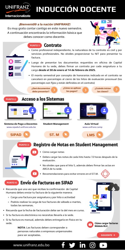 ¡Bienvenid@ a la nación UNIFRANZ! Es muy grato contar contigo en este nuevo semestre. A continuación encontrarás la información básica que debes conocer como docente.