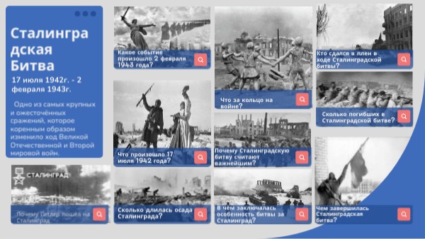 Сталинградская битва (1942-1943) - сражение, ставшее поворотным моментом в Великой Отечественной войне, во Второй мировой войне и в мировой истории. Советские войска разгромили немецкие армии и союзников фашистской Германии и, перехватив стратегическую инициативу, заложили фундамент Великой победы 1945 г.
