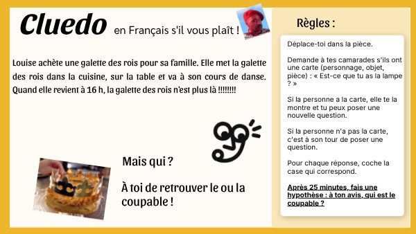 Louise achète une galette des rois pour sa famille. Elle met la galette des rois dans la cuisine, sur la table et va à son cours de danse. Quand elle revient à 16 h, la galette des rois n'est plus là !!!!!!!!