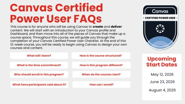 Upon successful completion of the course, participants will earn a micro-credential through Canvas Credentials. This micro-credential gives the graduates of the course the designation of Canvas Certified Power User.